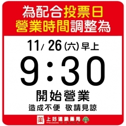 11/26 (六)逢選舉投票日 各門市延後開門營業