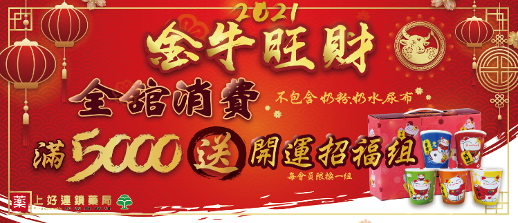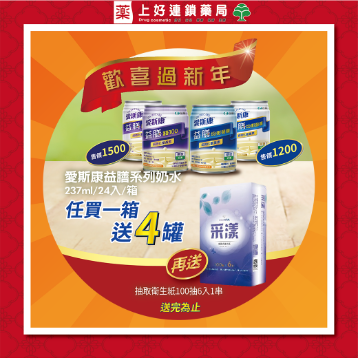【 年節送禮迎新春】 【新春滿額贈正式開跑】 【會員於活動期間內02/01~03/31】 全館當日單筆消費滿5000元,即可兌換 #開運招福杯組」乙組。 【 亞培安素獨家活動】 【會員於活動期間內】 至各門市現場加入亞培LINE@會員 即可免費兌換「 隨機亞培奶水任一罐」 加碼「買一箱再送一罐」 ●活動期間/每手機LINE帳號/限綁定一次,數量有限,兌完為止。●上好離所藥局留以其他商品代替之權利。 贈品送完為止