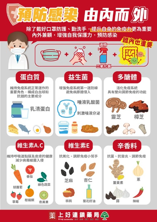 【預防感染,由內而外】 防疫期間,除了戴好口罩防護、勤洗手之外,提升自身的免疫力也是相當重要的喔!補充蛋白質、益生菌、多醣體、維生素A、C、E、辛香料,攝取均衡的營養,由內而外都兼顧,才能增強自我保護力,預防感染喔! 關鍵防疫,你我共同守護