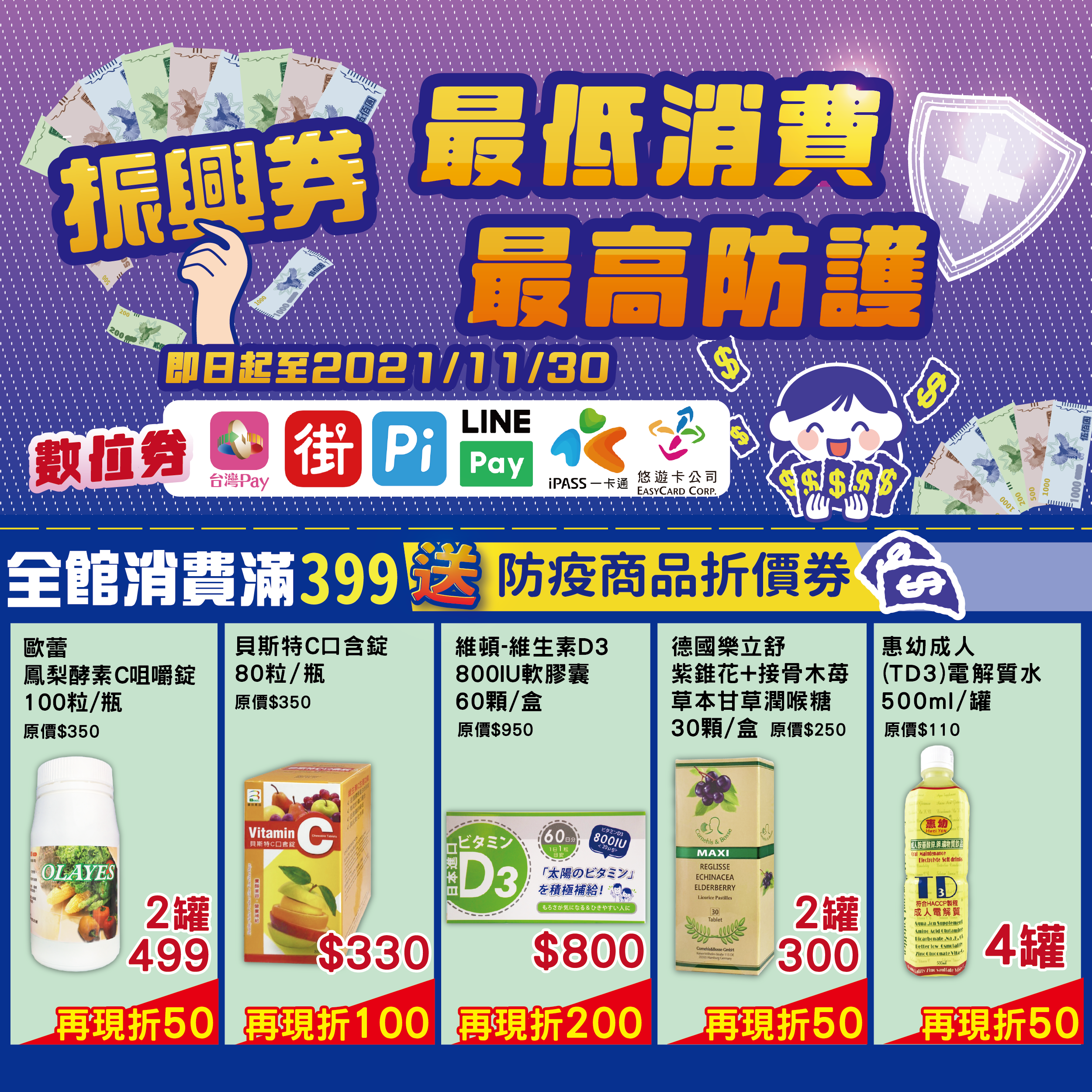 全館消費只要 滿399最高送200 防疫商品折價券!