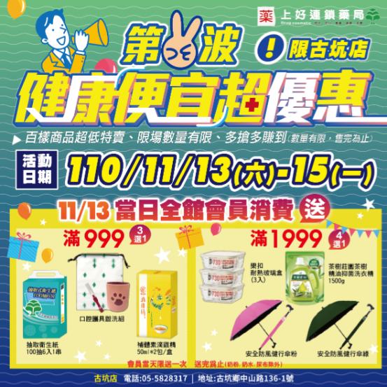 【古坑店第二波-健康便宜超優惠 】 全館滿額送補體素滴雞精 滿$999,好禮3選1 滿$1999,好禮4選1 11/14限定一天五折商品驚喜價 【上好藥局-古坑店】 05-5828317 雲林縣古坑鄉中山路136號 週一 ~ 週日 AM08:00 ~ PM21:40 https://goo.gl/maps/SxAHy8HCjZyW4vMv9