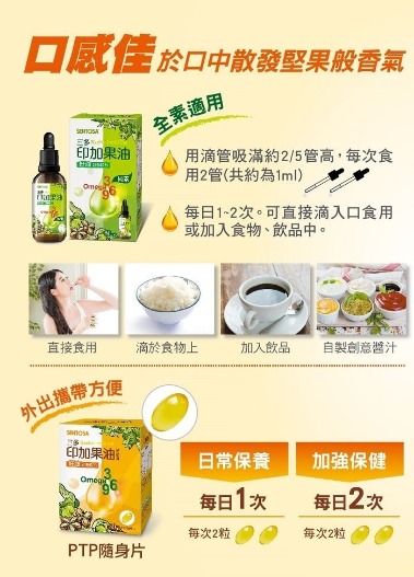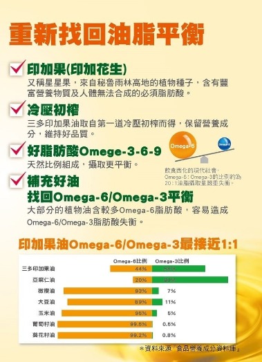 疫情爆發的關係,健身房是不是少去啦~吃太多導致代謝下降 身材有點微走樣~隆重推薦~~~「印加果油」 最大的特色在於,含有豐富的不飽和脂肪酸,適合全家老少植物性天然不飽和脂訪酸Omega3-6-9,其中mga3含最高哦。 小編研究了印加果油後,整理出一些選購重點: 1. Omega3、6、9不飽和脂肪酸含量90%以上,需冷壓初榨 (因為加工、加熱過程中印加果油容易氧化,會把天然維生素E、生育酚及植物固醇等營養素破壞掉。) 2. 大廠牌,挑選有安心認證檢驗 油品是要吃下肚的,通過各種安心檢驗SGS等是基本的。 3. 100%純印加果油 市面上會有不同的複方添加物來強化效果,但覺得還是要吃食物的原型(原型很重要),由印加果原果初榨的天然印加果油比較好。
