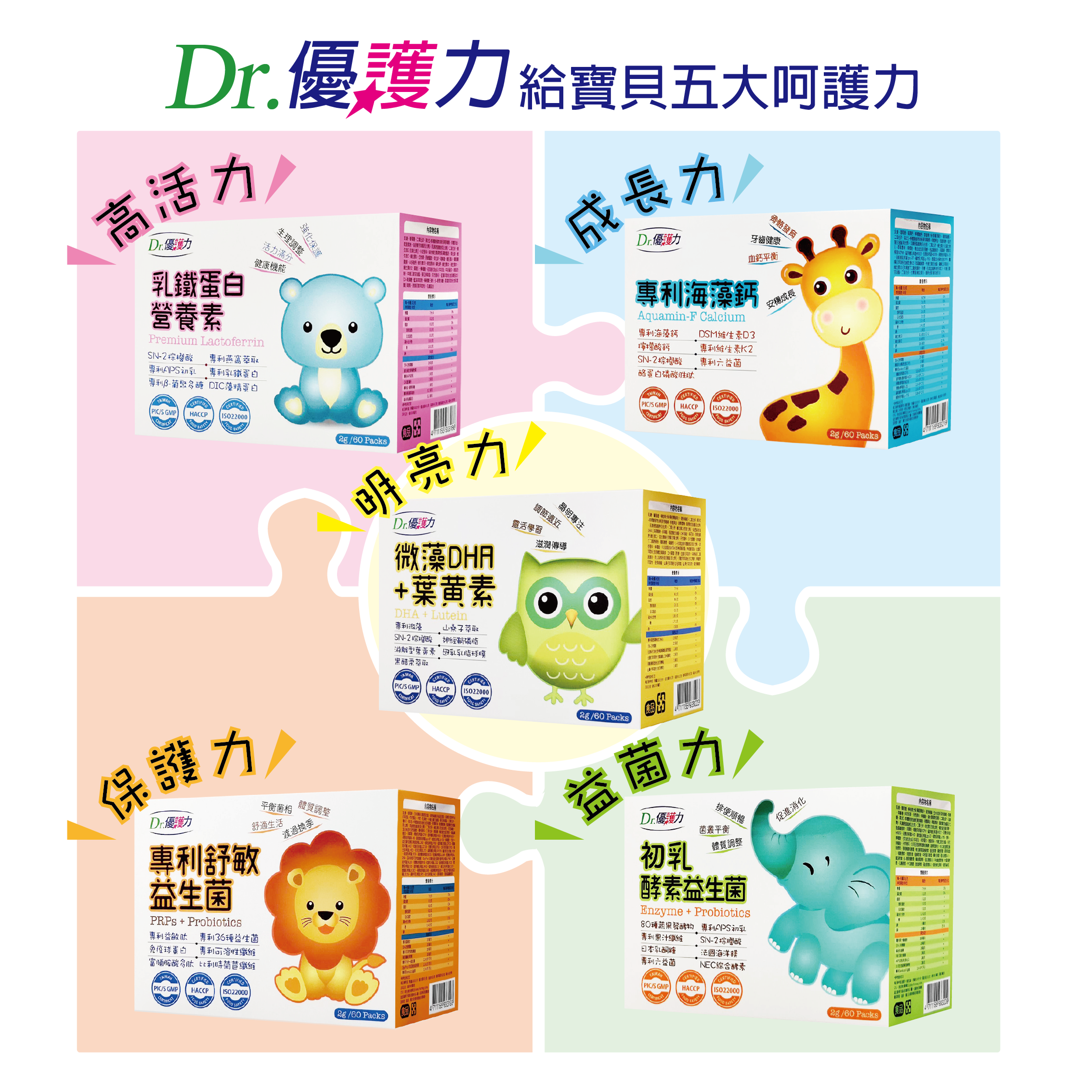 高活力、成長力、明亮力、保護力、益菌力