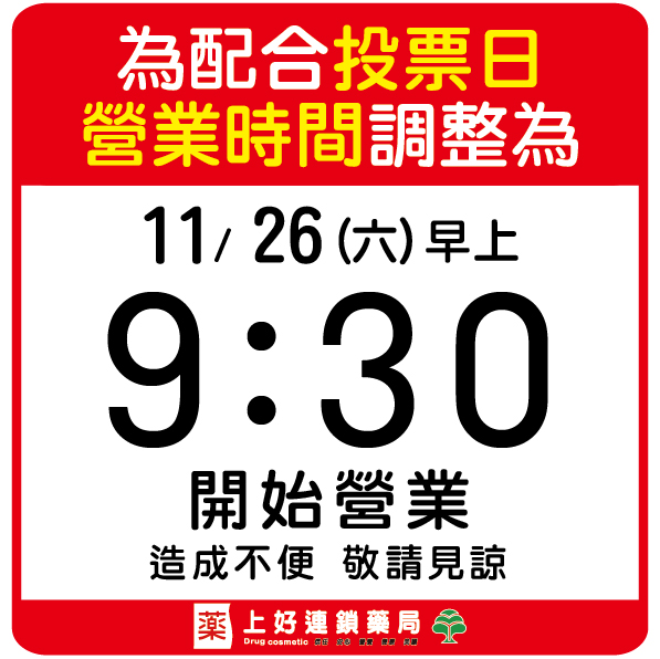 11/26 (六)逢選舉投票日 各門市延後開門營業 營業時間更動如下 永安店⏰ AM09:30 ~ PM22:00 上海店⏰ AM09:30 ~ PM22:00 中山店⏰ AM09:30 ~ PM22:00 古坑店⏰ AM09:30 ~ PM21:40