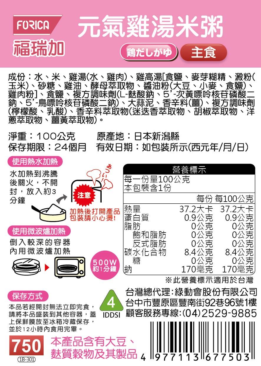 品名:日本【FORICA 福瑞加】元氣雞湯米粥 100g/包 規格:100g/包 ▶️實體店面購入,安心有保障。 ▶️「七天鑑賞期非試用期」,只接受瑕疵品退貨,在意者請勿下單。 ▶️部份商品運送過程中會有凹罐壓痕情形,能接受再下單。 ▶️祝您順心健康。 因實體店面同步販售,下單前請線上諮詢【確認庫存&效期】 線上諮詢